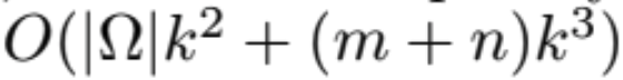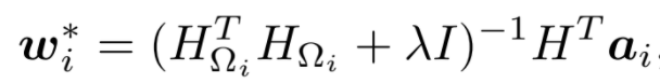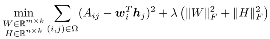 , where Ω is the set of indices for observed ratings. For updating each row of W or H, we need quadratic time to compute the H^T*H in the updating step, and cubic time to solve the least squares. Thus we have the overall complexity in this form. Though ALS has higher complexity per iteration than some other matrix factorization algorithms, it’s parallelizability, less iteration requirement to achieve good factorization results, and implementation in Spark MLlib make it easy to scale up the dataset.