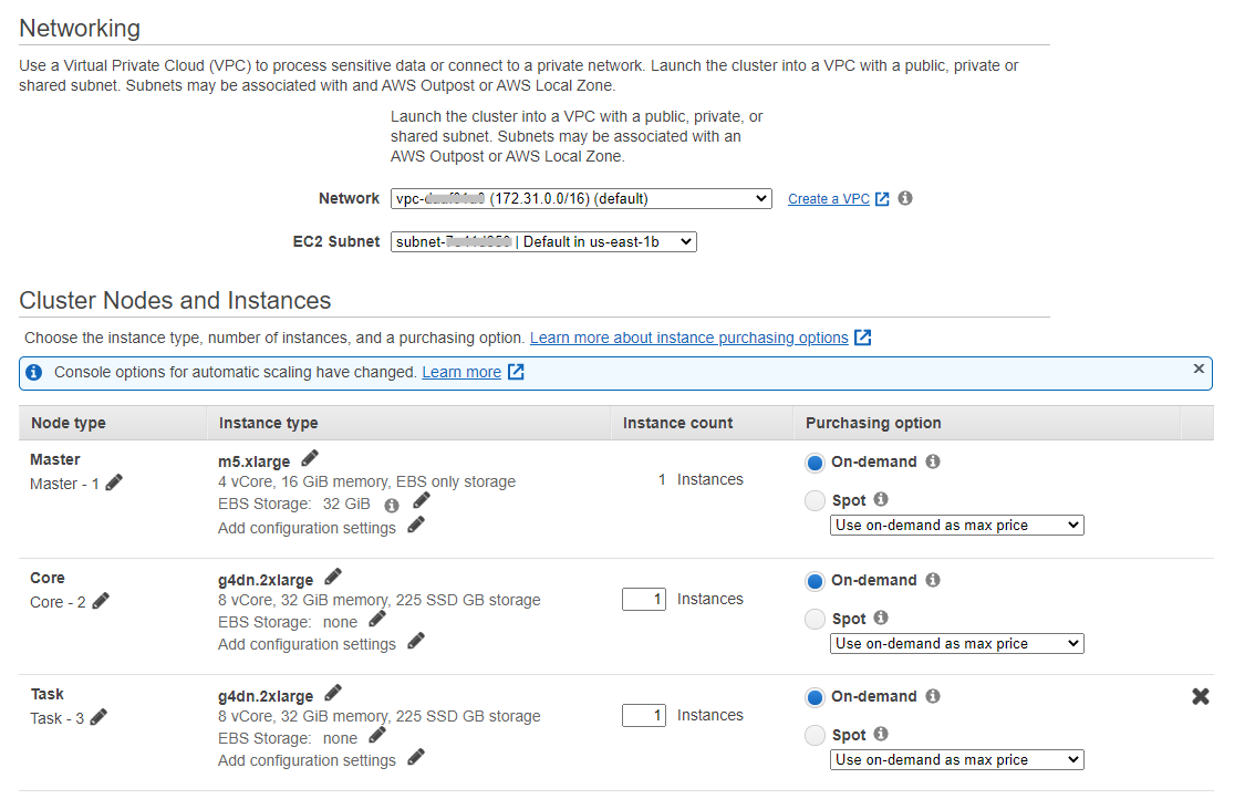 - Master: m5.xlarge, 4 vCore, 16 GiB memory, EBS Storage:64 GiB