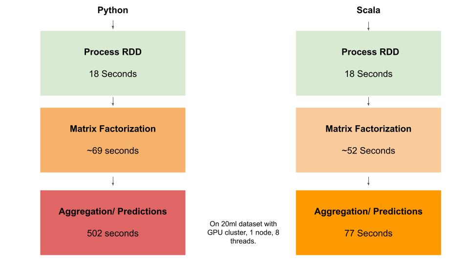 Below are the results when using the CPU and GPU clusters on the 20M dataset for the Python and Scala recommender scripts