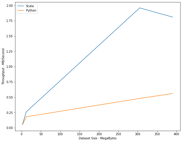 | Dataset Size | Python (runtime/ throughput) | Scala (runtime/ throughput) |
